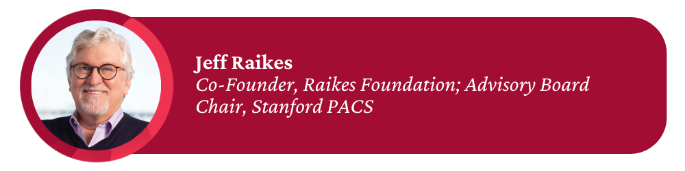 Jeff Raikes is a co-founder of the Raikes Foundation with his wife, Tricia. The Foundation works toward a just and inclusive society where all young people have the support they need to achieve their full potential. Key areas of focus include reimagining an educational system that creates conditions for all students to succeed; ensuring housing stability for youth; building a fair and representative democracy; and supporting donors and philanthropic organizations in moving resources toward justice.